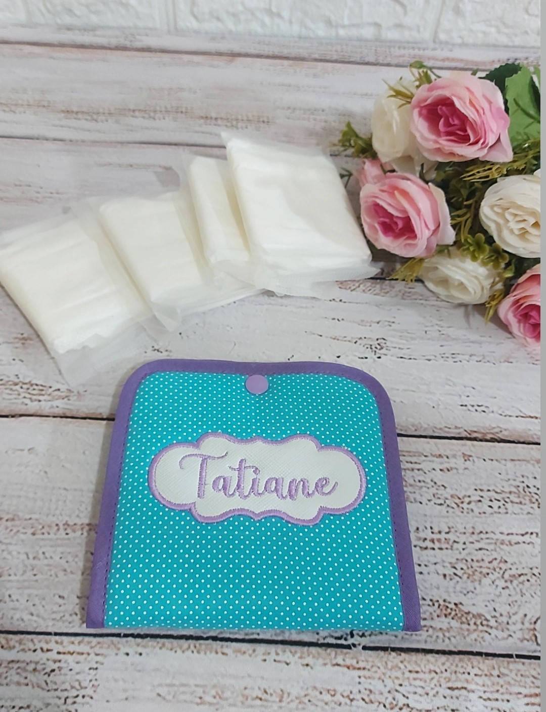 Porta absorvente personalizado com bordado, feito com tecido 100% algodão, ideal para manter sua bolsa sempre organizada.